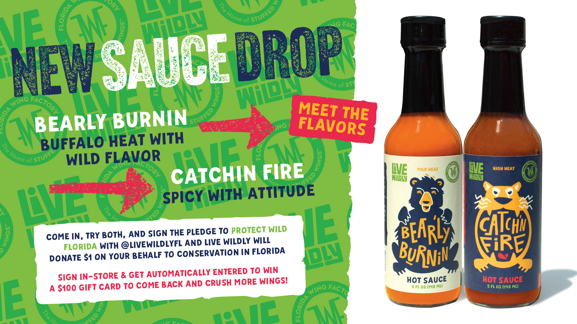 To celebrate the launch of the mild to wild sauces, Florida Wing Factory in Tallahassee will host an in-store promotion from May 17-31. Guests who visit and sign the Live Wildly pledge in person will receive a free bottle of hot sauce - either Bearly Burnin' or CATchin' Fire - and be entered to win a $100 Florida Wing Factory gift card.