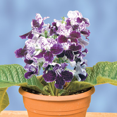 The blossoms on Cape Primrose "Remembering John" are a mix of purple, dark blue and white. There is deep purple veining in the throat of each blossom and the undersides are white. Like most easy-to-grow Cape Primroses, "Remembering John" is perfect for beginners who have never grown a flowering houseplant before. "Remembering John" will flower well on a partially sunlit window or even under fluorescent lighting.