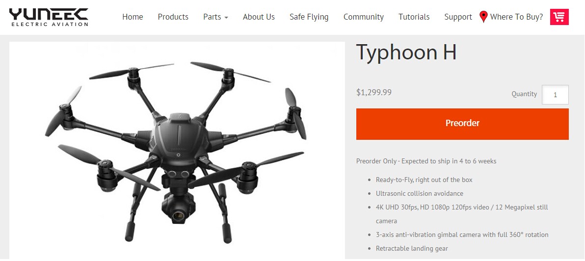 Three months after CES, Yuneec still hadn’t officially released or started to sell the Typhoon H with Intel’s RealSense technology. Speculation was that the technology was still under development, with no clear date when it would be complete. Numerous reliable sources say the distance detection and obstacle-sensing performance of RealSense was disappointing in direct sunlight, which may be why – according to buzz on the Internet — why the Typhoon H’s outdoor obstacle-avoidance videos were shot in cloudy weather. As Yuneec started to ship in May, only the version of the Typhoon H with ultrasonic avoidance was listed on the company’s English website, at a $1299 retail price.