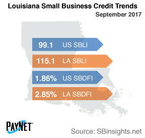 Baton Rouge, LA, November 21, 2017 (Newswire.com) - Data published by PayNet illustrate that the percentage of small businesses defaulting on existing loans has fallen in Louisiana and the level of borrowing activity improved in September 2017. The indices suggest that financial conditions in the state may improve.