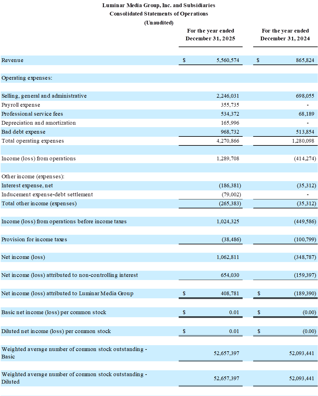 Juan M. Sese, CFO of Luminar Media Group said "We have significantly strengthened our operational discipline, refined our processes and built a platform designed to scale rapidly without compromising quality or control. Our commitment to transparency, tailored solutions and long-term customer relationships is resonating strongly in the market, fueling customer loyalty and expanding our footprint. As part of our year-end reporting, we have aligned our GAAP presentation with auditor guidance. While this represents a more conservative accounting treatment, it does not change the underlying strength of our business. Our operational KPIs remain fully intact, and we remain profitable under this methodology."
