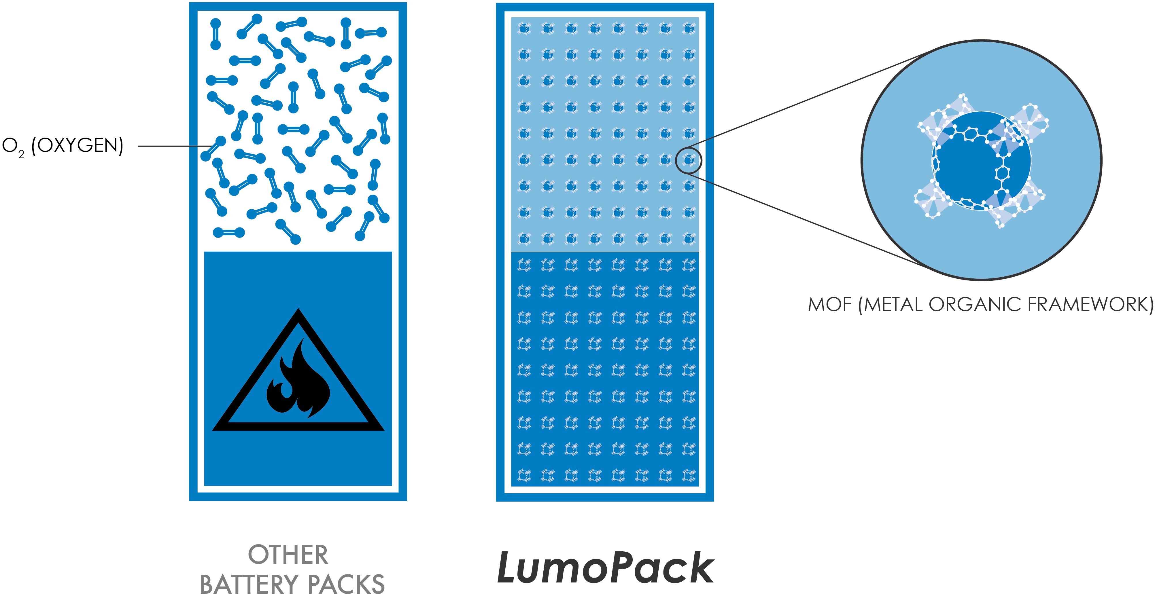 Increased Safety - As time passes, lithium-ion battery cells degrade, which in turn leaves space in the cell for unwanted gases to enter. This is what can cause batteries to bulge, catch on fire, or even explode. The technology (MOF) inside LumoPack coats and protects LumoPack’s battery cells, thus significantly reducing these risks.