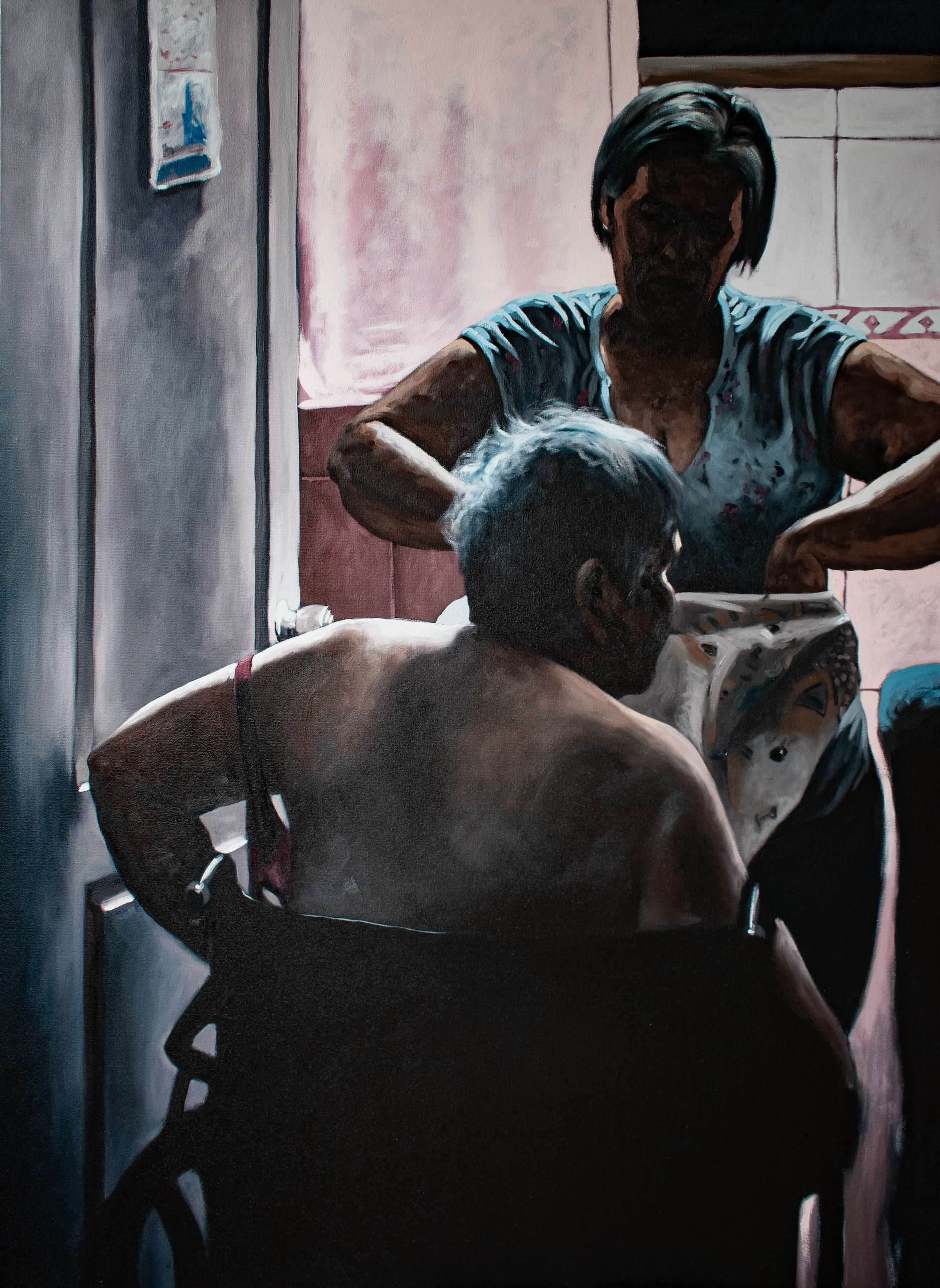 This series represents a contemplative examination of caregiving, memory, and the inherent fragility that accompanies growing older. Each piece in the collection reveals moments of Mejía’s personal journey, depicting the nuanced interactions between those who care for loved ones and those who depend on them. Mejía brings to the surface intimate yet universal themes that tend to be hidden from view.