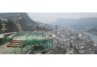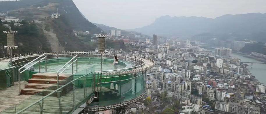 The most remarkable pool of Cliff Hot Spring is a special long-arm hanging glass transparent bath made of high-strength tempered glass. The mountain peak is 150 meters above the ground, the pool stretches 45 meters away from the cliff edge, the sidewalk is 4.5 meters, and the bathing area is 38 square meters.
