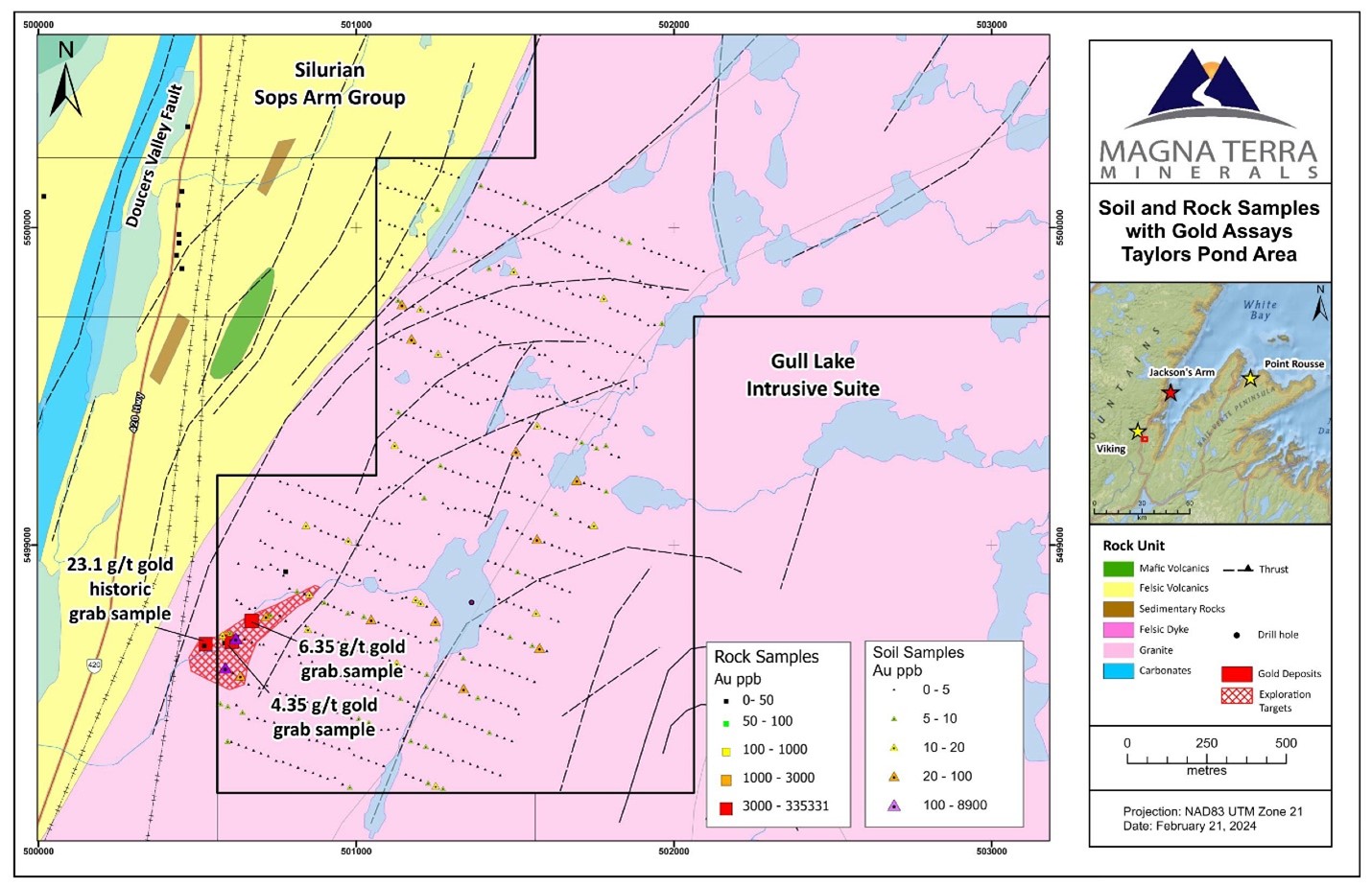 - Discovery of a new zone of gold mineralization assaying up to 6.35 g/t gold from grab samples at the Taylors Pond Prospect (Figure 2) coincident with a 300-metre long soil geochemical anomaly with assays up to 273 ppb gold (see details below);