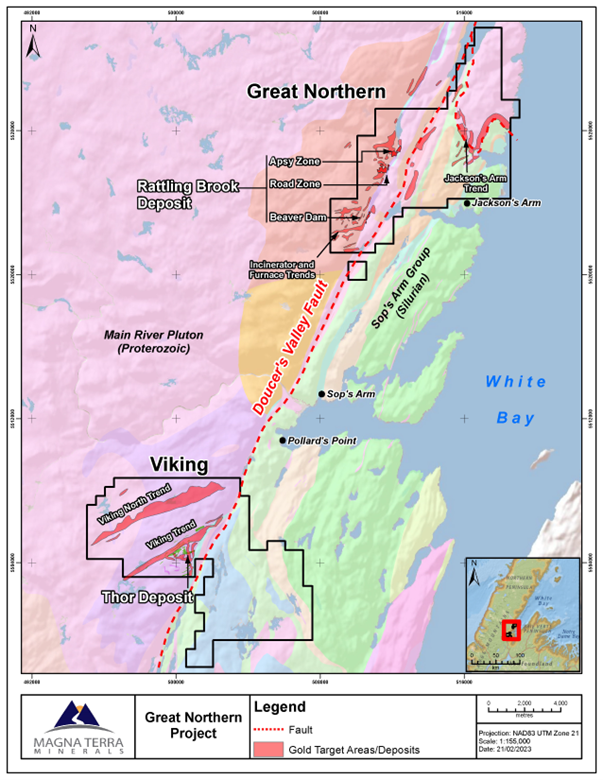 The Projects are centered along a 30-kilometre section of the Doucers Valley Fault, a significant geological control on, and host to, several gold deposits and untested prospects, including the Rattling Brook and Thor Deposits plus the Incinerator, Furnace, Jacksons Arm, Viking, Kramer, Viking North, and Little Davis Pond mineralized trends. This proven gold environment with existing Mineral Resources and numerous untested gold trends occurs over a cumulative 30+ kilometre strike length. Gold mineralization is hosted within a variety of rock types that include Precambrian or Ordovician granites as well as younger volcanic and sedimentary rocks, typically along splays off the Doucers Valley Fault. This is a similar geological/structural environment to Calibre Mining Corporation's (formerly Marathon Goldold Corp.) Valentine Gold Project. Alteration consists of mesothermal style quartz ± iron carbonate ± sulfide veins and stockworks with 2 to 5% total sulfides consisting of pyrite, galena, chalcopyrite, or sphalerite. These mineralized veins locally show trace amounts of visible gold.