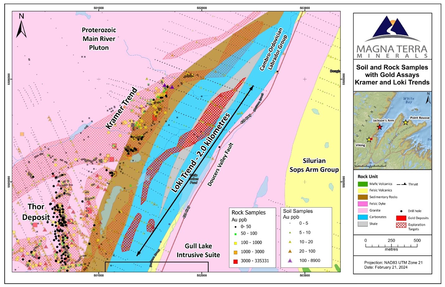 "In the late fall of 2023 we conducted a modest exploration program that focused on key areas identified for their discovery potential based on existing information and were able to discover several new gold trends. Soil sampling and prospecting outlined new zones of gold mineralization, proximal to existing resources at the Road Zone indicating there is potential to expand the deposit an additional 500-metres southward. Soil sampling led to the discovery of the new 2.0-kilometre long Loki Trend, and the discovery of bedrock mineralization at Taylors Pond opens up new opportunities for mineralization in that area. With more than 30+ cumulative kilometres of strike potential, our Great Northern Project includes an impressive number and expanding scale of high-priority drill ready targets and underscores the potential of the Project to host multiple large gold systems."