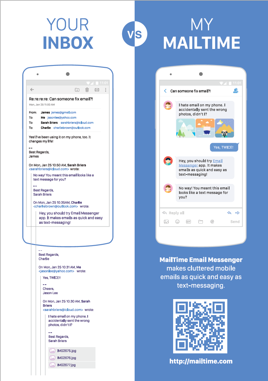 MailTime is a mobile app that blurs the lines between instant messaging (IM) and emailing. Unlike conventional IM platforms that require people to download the same app, MailTime relies on email protocol. Thus, MailTime users can communicate with any email address – the recipient doesn’t need to have the app. MailTime’s content parsing engine simply cuts out annoying metadata and display emails in bubbles that resemble IM.