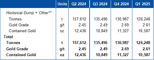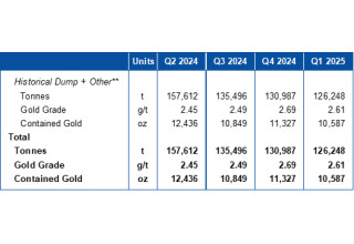 During Q1 2025, the plant throughput rate averaged 608 tpd, 22% above nameplate capacity. Mill availability remained high at 98% which compares favorably with industry averages. The mill head grade averaged 7.10 g/t Au, comprised of 52% diluted vein material and 48% historical dump + other material. A total of 10,436 ounces of gold were recovered during the quarter at a mill recovery of 85.3%.