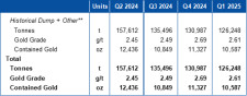 19,650 tonnes mined from historical dump and other mineralized material above cutoff grade ("historical dump + other") containing 1,875 oz Au at 2.97 g/t Au and 2,259 oz Ag at 3.58 g/t Ag