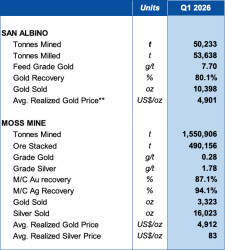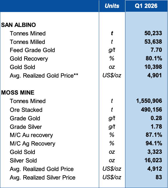Table 1 - Detailed Operating Results for San Albino (Q2 2025 - Q1 2026)