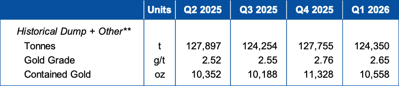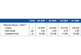 19,200 tonnes mined from historical dump and other mineralized material above cutoff grade ("historical dump + other") containing 1,925 oz Au at 3.12 g/t Au and 1,984 oz Ag at 3.21 g/t Ag