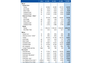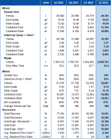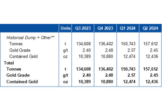 The mine produced an average of 654 tonnes per day of diluted vein and historical dump + other material in Q2 2024, with a strip ratio of 34.4:1, including pre-stripping for the commencement of Bayacun Phase 2 within the Las Conchitas-South area. The strip ratio was elevated due to accelerated waste development in preparation for the rainy season that commenced in June 2024, allowing for access to Bayacun Phase 2 later this year. The current stockpile is estimated at 157,612 tonnes containing 12,436 oz Au at 2.45 g/t Au. The average grade of the diluted vein was 14.25 g/t Au containing 11,160 oz Au.