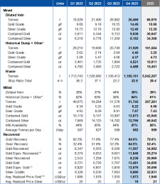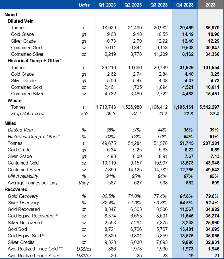 The total production of diluted vein material in Q4 2023 was produced from 5 different zones, 37% of the total ounces were mined from Mina Francisco Pit, 33% from West Pit, 16% from San Pablo Pit, 10% from Southwest Pit, and 3% from Phase 1 in the Bayacun Pit. We expect to produce the high-grade diluted vein material from Bayacun, El Limon and the Phase 3 push back at the West Pit for the first quarter of 2024.
