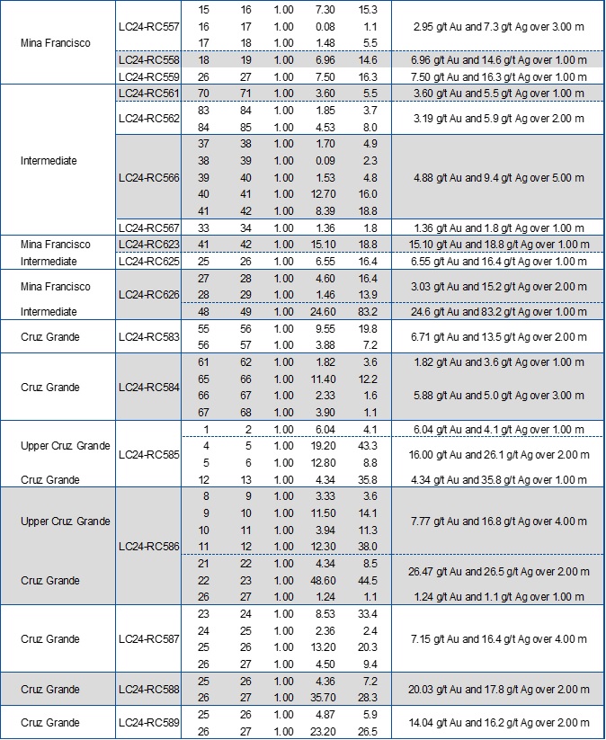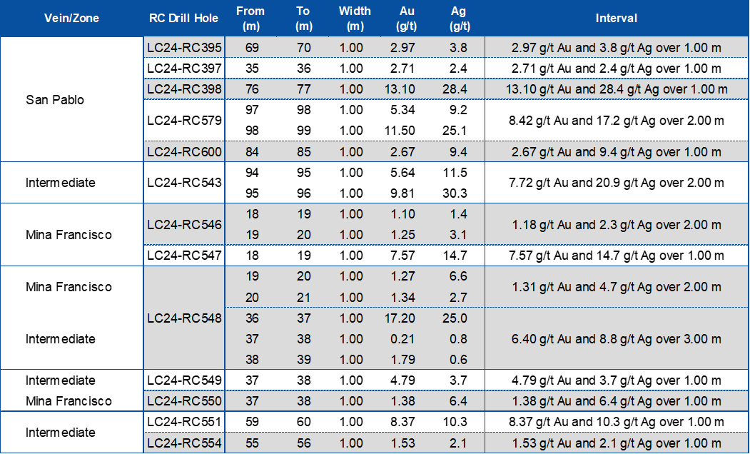 LC24-RC626, situated between two pits defined in the MRE, intersected 24.6 g/t Au and 83.2 g/t Ag over 1.0 m (1.0 m ETW), 38 m below surface. This drill hole confirms structural continuity of the vein and demonstrates a 20 m down-dip extension from LC24-RC505 (see press release dated July 29, 2024) which intersected 25.01 g/t Au and 76.2 g/t Ag over 2.0 m (1.3 m ETW) at 28 m below surface. In addition, the same drill hole, LC24-RC626, intersected the Mina Francisco vein (see table below), 21 m below the surface, grading 3.03 g/t Au and 15.2 g/t Ag over 2.0 m (1.3 m ETW).