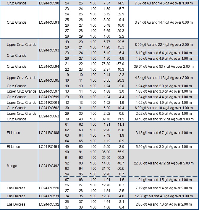 In the Las Dolores area, the key objective of the 2024 drilling program has been to test extensions of shallow, high-grade mineralized zones beyond the current MRE pit limits. Drill hole LC24-RC531 intersected 12.30 g/t Au and 4.8 g/t Ag over 1.0 m (0.7 m ETW), 30 m below surface and 22 m below the pit limit defined by the MRE. These results for Las Dolores are consistent with those from previous releases, including drill hole LC24-RC459 which intersected 16.83 g/t Au and 26.4 g/t Ag over 6.0 m (4.7 m ETW), 17 m below surface confirming a 16 m southwest strike extension of the mineralization intersected by LC24-RC458 of 30.85 g/t Au and 34.0 g/t Ag over 2.0 m (1.8 m ETW), 11 m below surface (see press releases dated August 28th, 2024 and July 29th, 2024).