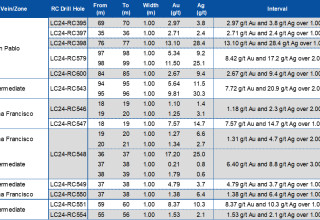 Two drill holes, reported in this press release, LC24-RC398 and LC24-RC623, successfully tested the down-dip extension of two high-grade gold veins, San Pablo and Mina Francisco, both exposed in two pits within the current MRE. Drill hole LC24-RC398 intersected 13.10 g/t Au and 28.4 g/t Ag over 1.0 m (0.8 m ETW), 76 m below surface and 88 m down-dip outside the current San Pablo pit. Drill hole LC24-RC623 intersected 15.10 g/t Au and 18.8 g/t Ag over 1.0 m (0.9 m ETW), 33 m below surface. This drill hole extends the high-grade gold vein 55 m down-dip, outside the current MRE pit limit.