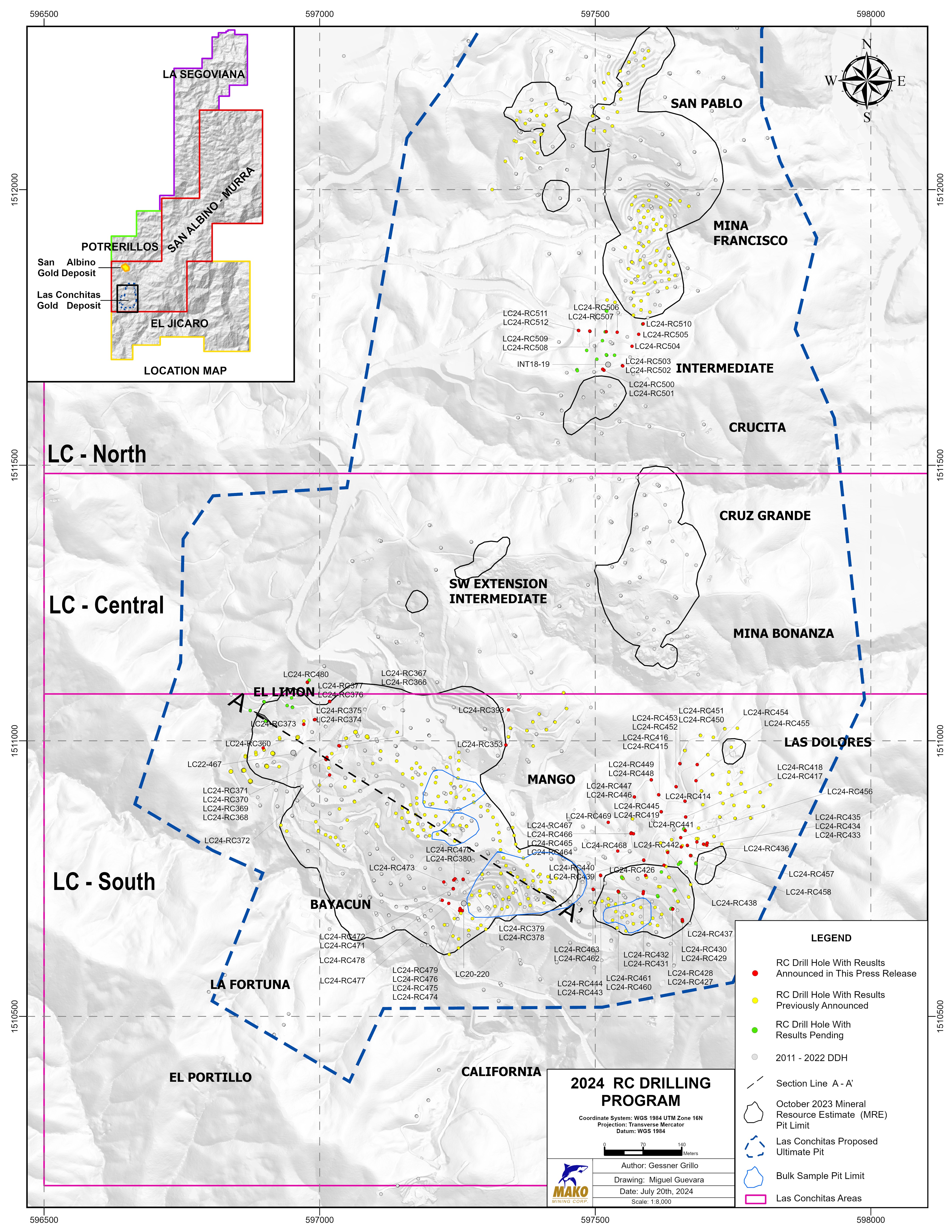 VANCOUVER, BC, July 29, 2024 (Newswire.com) - Mako Mining Corp. (TSX-V:MKO)(OTCQX:MAKOF) ("Mako" or the "Company") is pleased to provide additional exploration results from the ongoing reverse circulation (RC) drill program at Mako's newest mining area, Las Conchitas, located immediately south of the Company's San Albino gold mine.