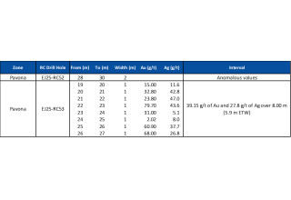 Drill hole EJ25-RC53 (270/-60) intersected a wide, high-grade interval (see table below) of 39.15 g/t Au and 27.8 g/t Ag over 8.0 m (5.9 m ETW), 19.2 m below surface. Hole EJ25-RC53 tested a prominent NE-SW oriented structure interpreted from geochemical soil sampling and geological mapping of underground workings which the Company initiated late last year after being granted access for the first time in 15 years from the local landowner. This structural orientation is known to control gold mineralization at the San Albino and Las Conchitas deposits. Drill hole EJ25-RC52 (0/-90), drilled from the same drill pad, intersected a strongly sheared and disturbed zone with anomalous gold values.