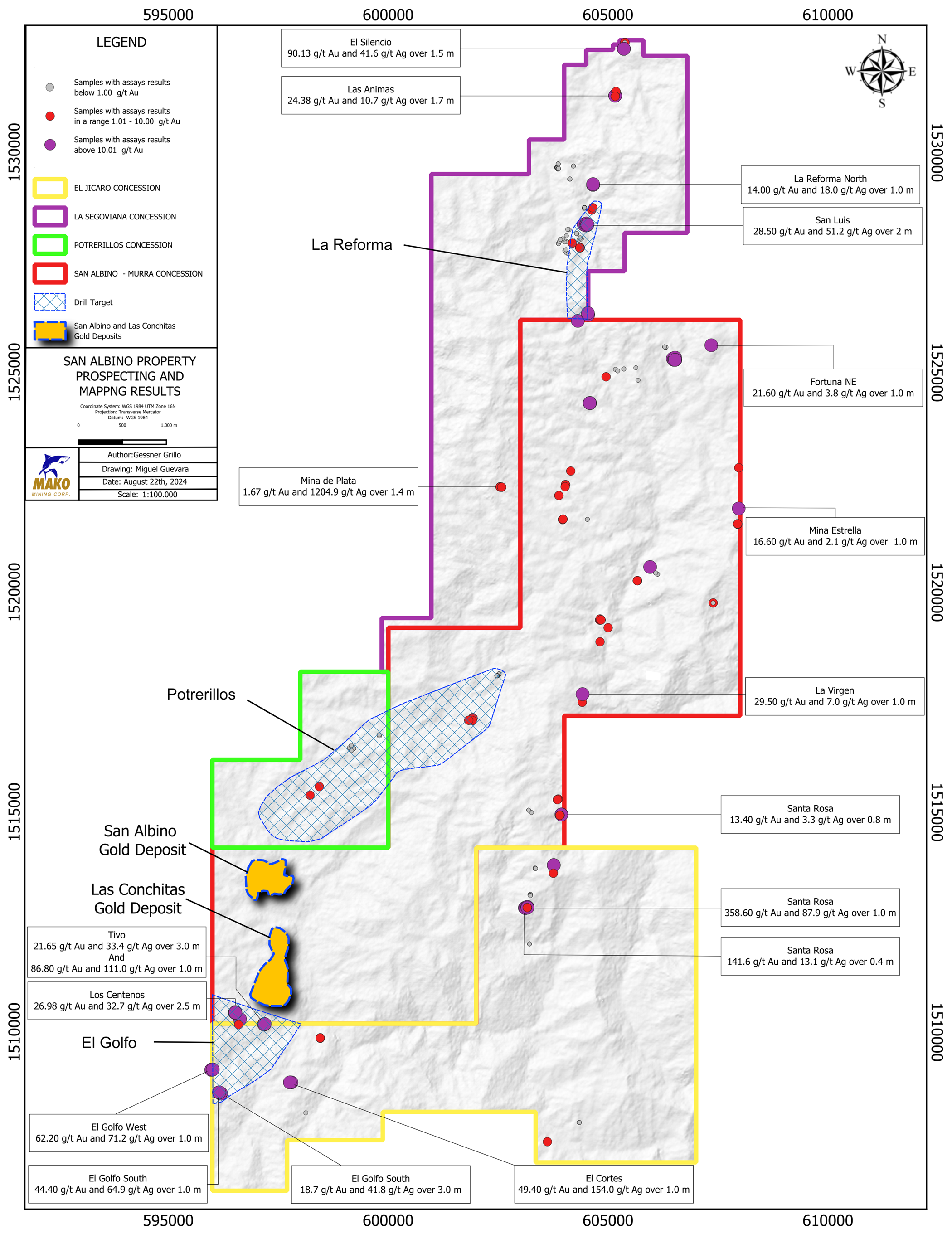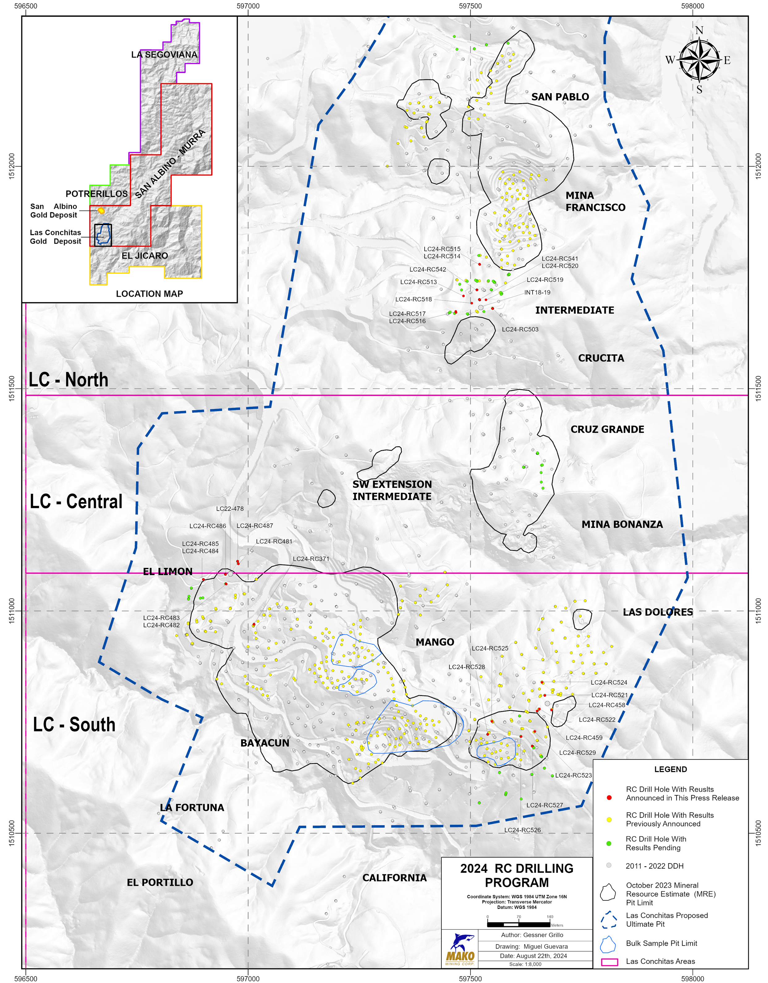 VANCOUVER, BC, August 28, 2024 (Newswire.com) - Mako Mining Corp. (TSX-V:MKO)(OTCQX:MAKOF) ("Mako" or the "Company") is pleased to provide additional exploration results from the 2024 reverse circulation (RC) drill program in the Las Conchitas area, located immediately south of the Company's San Albino gold mine, and additional results from an ongoing regional reconnaissance program within Mako's 188 square kilometres land package.