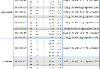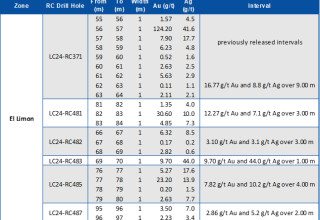 LC24-RC520 intersected 82.55 g/t Au and 76.9 g/t Ag over 2.0m (2.0m ETW), 46.5m below surface. This drill hole confirms structural continuity of the vein and demonstrates strike extensions of the high-grade mineralization intersected previously in diamond drill hole INT18-19 (see press release dated November 28th, 2018) which intersected 16.65 g/t Au and 12.1 g/t Ag over 1.20 m, located 14m northeast along strike.