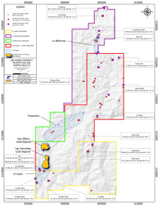 The ongoing reconnaissance exploration program covers the Company's entire 188 square kilometer land package and includes geological mapping and sampling of exposed mineralized veins, local mine dumps, and, where safely accessible, underground workings. The main objective of the reconnaissance exploration program is to collect key structural data of mineralized veins, extend previously exposed high-grade gold mineralization and prioritize drilling targets, such as El Golfo, Potrerillos and La Reforma (see Figure 2) and to identify additional gold targets for follow-up exploration and drilling.