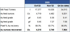 Mill head grades have been exceptionally high during the quarter averaging 8.41 g/t Au at 86.6% recoveries. December is continuing this trend which will lead to a record quarter in both gold ounces recovered and gold ounces sold. A comprehensive quarterly production update will be released later in January 2024.