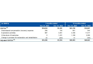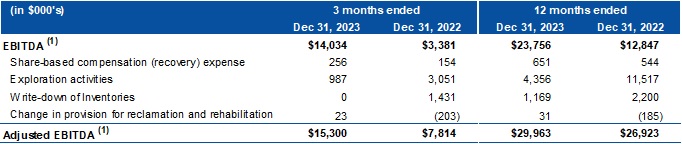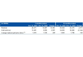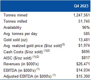 The Company's financial results for Q4 2023 reflect record gold sales of US$26.5 million, which generated US$16.8 million in Mine Operating Cash Flow (1) (3), and US$9.5 million in Net Income. Revenues, Adjusted EBITDA (1) and Mine Operating Cash Flow (1) (3) were all at record levels. The Company reported US$0.145 in earnings per share (EPS) during the quarter, while selling 13,481 oz of gold at $817 All-In Sustaining Cost ("AISC") ($/oz sold (1) (2)).