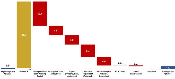 - $1.0 million in exploration and evaluation expenses ($0.2 million in areas surrounding San Albino and approximately $0.8 million at Las Conchitas).