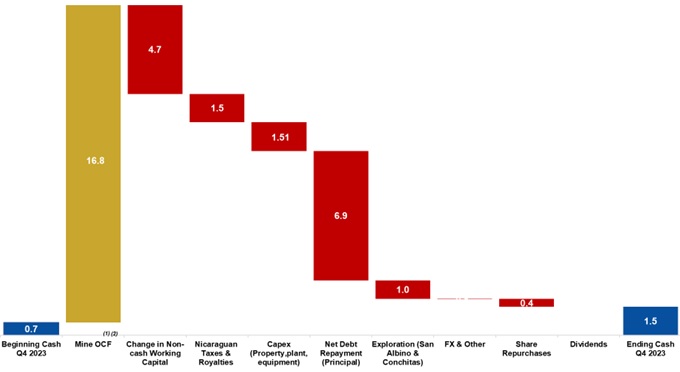 - Refer to "Chart 1 - Q4 2023 - Mine OCF Calculation and Cash Reconciliation (in $ millions)" for a reconciliation of the beginning and ending cash position of the Company, including OCF.