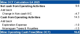 Q4 2023 - Mine OCF Calculation and Cash Reconciliation (in $ millions)