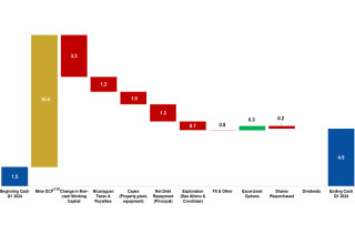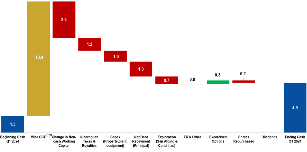 - Refer to "Chart 1 - Q1 2024 - Mine OCF Calculation and Cash Reconciliation (in $ millions)" for a reconciliation of the beginning and ending cash position of the Company, including OCF.