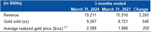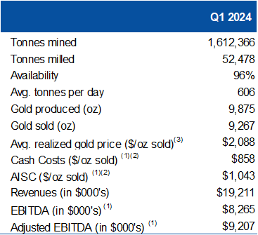 The Company's financial results for Q1 2024 reflect gold sales of US$19.2 million, which generated US$10.4 million in Mine Operating Cash Flow (1) (3), and US$5.3 million in Net Income. The Company reported US$0.08 in earnings per share (EPS) during the quarter, while selling 9,267 oz of gold at $1,043 All-In Sustaining Cost ("AISC") ($/oz sold (1) (2)).