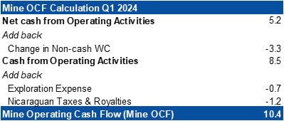 Q1 2024 - Mine OCF Calculation and Cash Reconciliation (in $ millions)