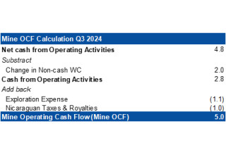 "Mine OCF" represents operating cash flow, excluding Nicaraguan taxes and royalties, changes in non-cash working capital and exploration expenses.
