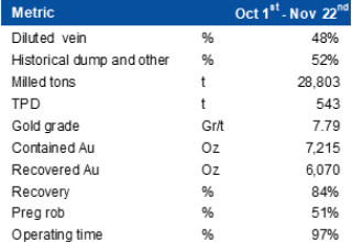 Akiba Leisman, Chief Executive Officer, states that "Q3 2024 production was constrained by a six-month permit delay for the Las Conchitas EIA which arrived at the beginning of the quarter. 6,532 ounces of gold were sold at $2,383/oz AISC, with $607 per ounce of this AISC related to the 1.3 million tonnes of accelerated pre-strip which needed to be removed outside of our original bulk sample permit area. Also related to the permit delay, the remainder of the increase in AISC was due to lower head grades (4.2 g/t gold) as only 14% of the mill feed derived from diluted vein material instead of the approximately 50% blend that is normally available. Consistent high-grade mineralization was only available in September after the 1.3 million tonnes of waste was removed. Despite this, the Company generated $4.3 million in Adjusted EBITDA and positive net income. Through the first 52 days (57%) of Q4 2024, production is back to normal, with head grades up over 85%, recoveries up over 10% and realized gold prices up over 10% relative to Q3 2024 (see Table 1 below). Therefore, there will be a commensurate increase in production, reduction in AISC and increase in profitability for Q4 2024.