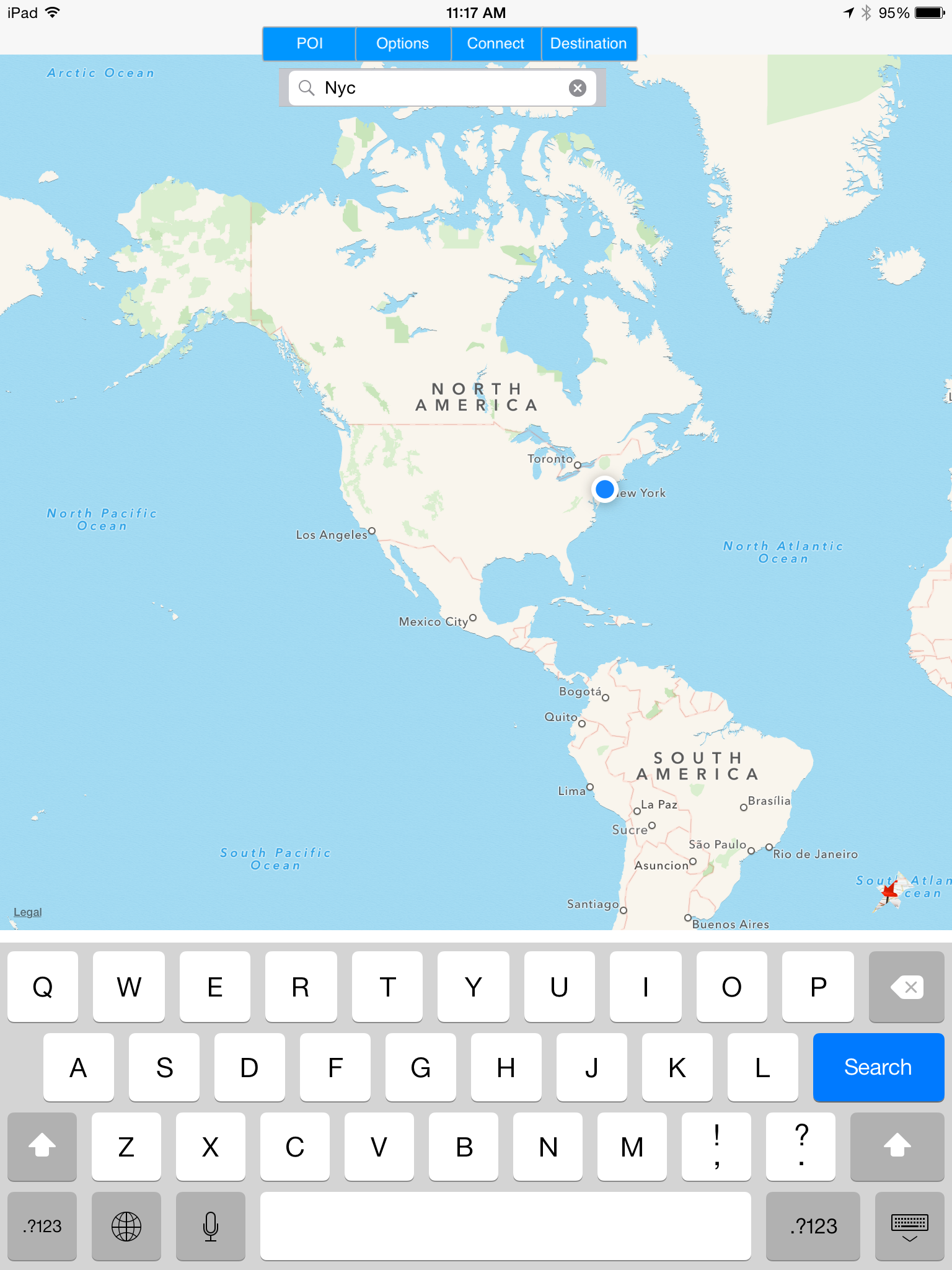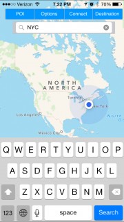 MapItOut prompts the user to begin by entering a city name or address located anywhere in the world and reveals its location in a pinpoint on the map. By selecting Next, users can search for multiple addresses during one session. Users can also research Points of Interest (POI) nearby by tapping the POI button at the top of the interface. POIs are categorically divided into Map Types. They include:
