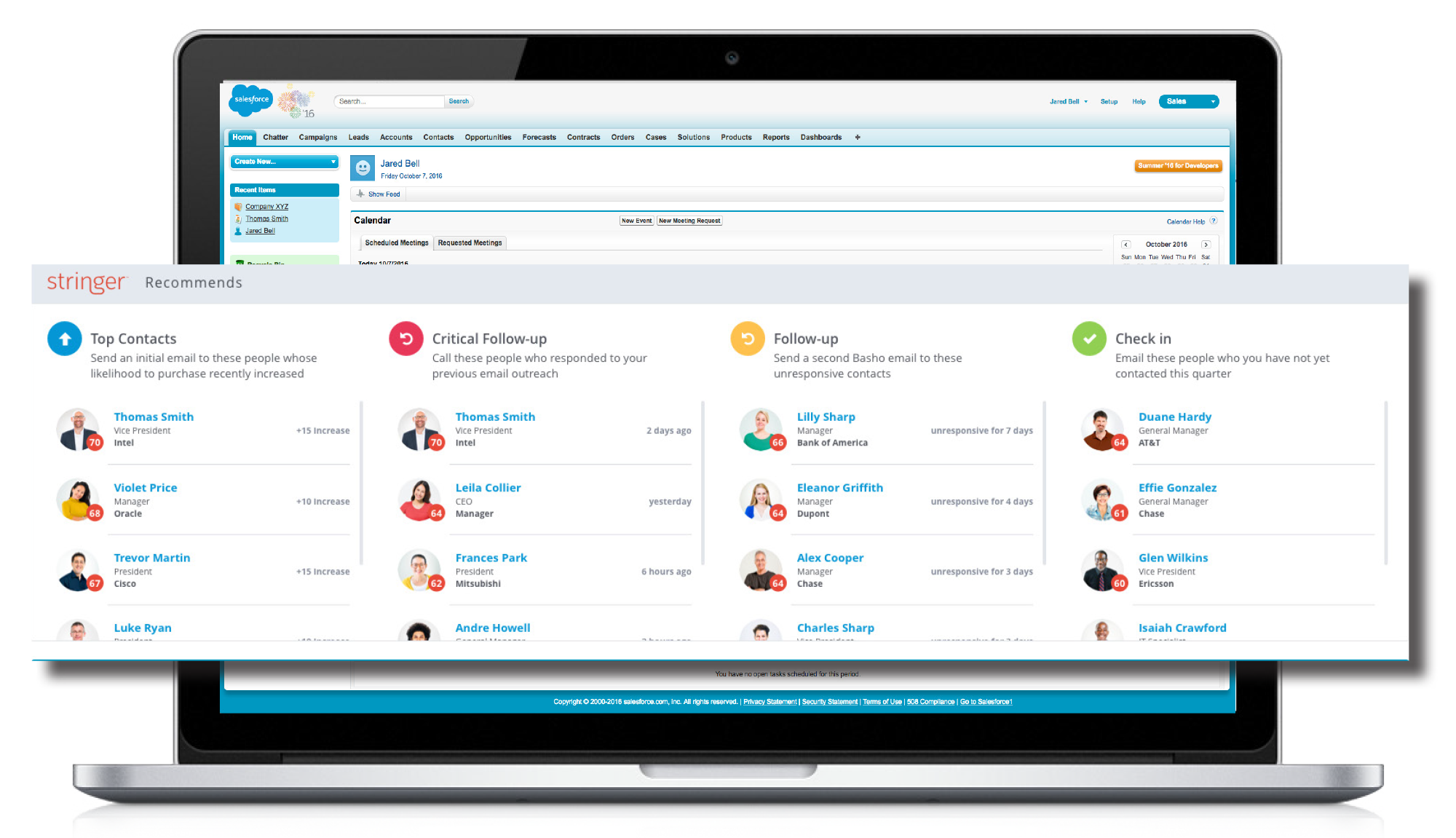 Stringer for Salesforce strings together data from Salesforce CRM, marketing automation, content management systems and internal/external data sources, to offer prescriptive insights and alert sales teams on ready-to-buy contacts. The solutions capabilities center around an intelligent workflow that prioritizes contacts and recommends relevant content that can be shared via a one-click email workflow.