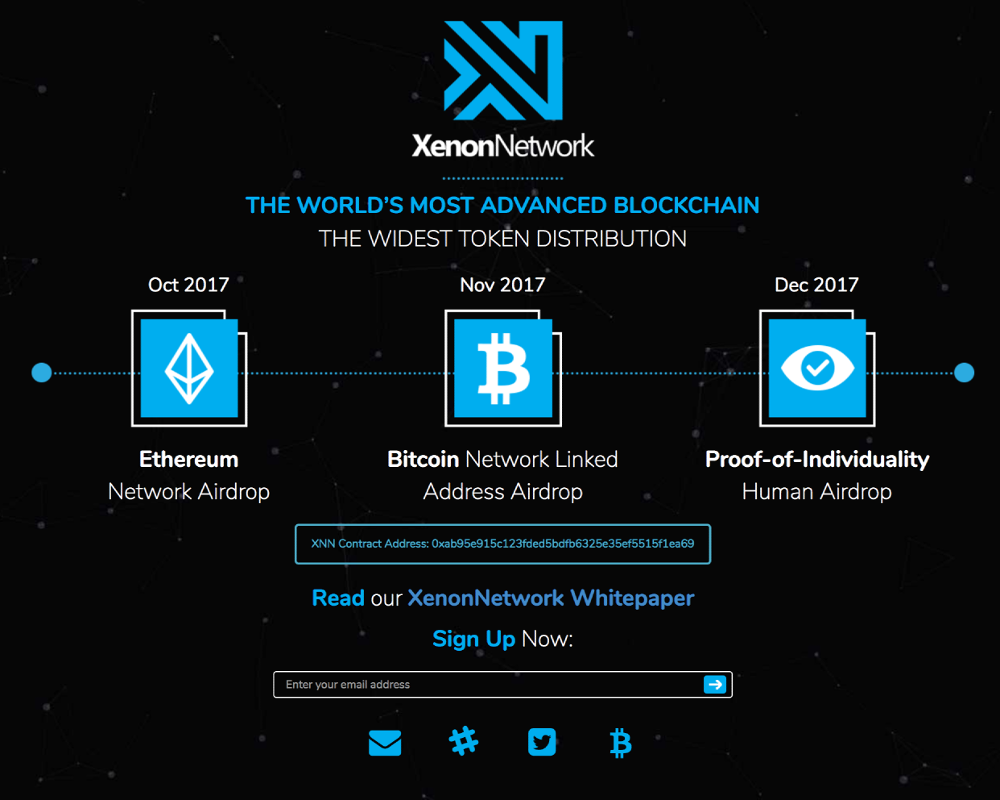 AUCKLAND, New Zealand, October 7, 2017 (Newswire.com) - XenonNetwork, an enterprise-scale blockchain launching in July 2018 begins a massive distribution of their native Xenon (XNN) ERC-20 compatible tokens to over 400,000 active Ethereum addresses at the beginning of October. In addition to this, a similar distribution to bitcoin holders will occur in November, followed by a proof-of-individuality public token distribution from November through June 2018.