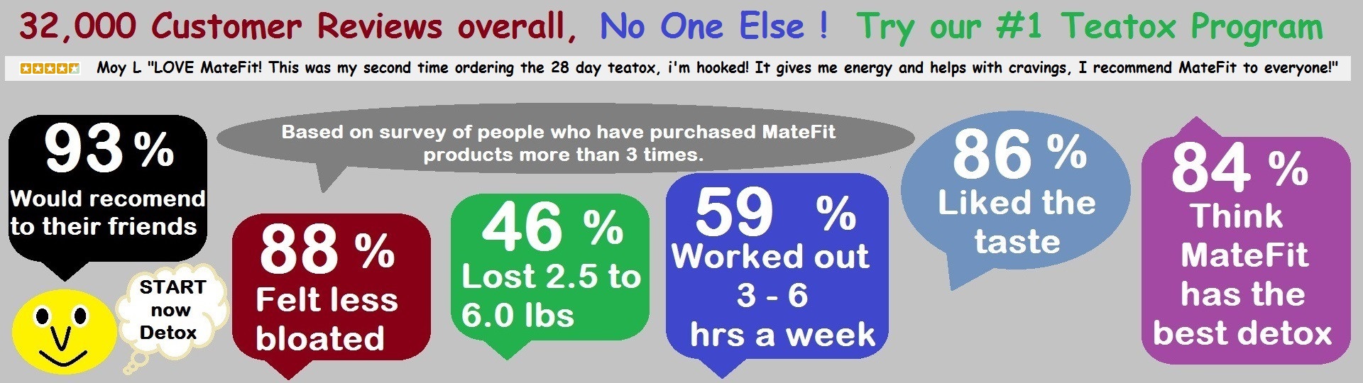 In a recent MateFit online survey, 93 percent of consumers said they would recommend the Teatox program to family and friends. 88 percent reported feeling less bloated, and 84 percent considered it the best detox product.