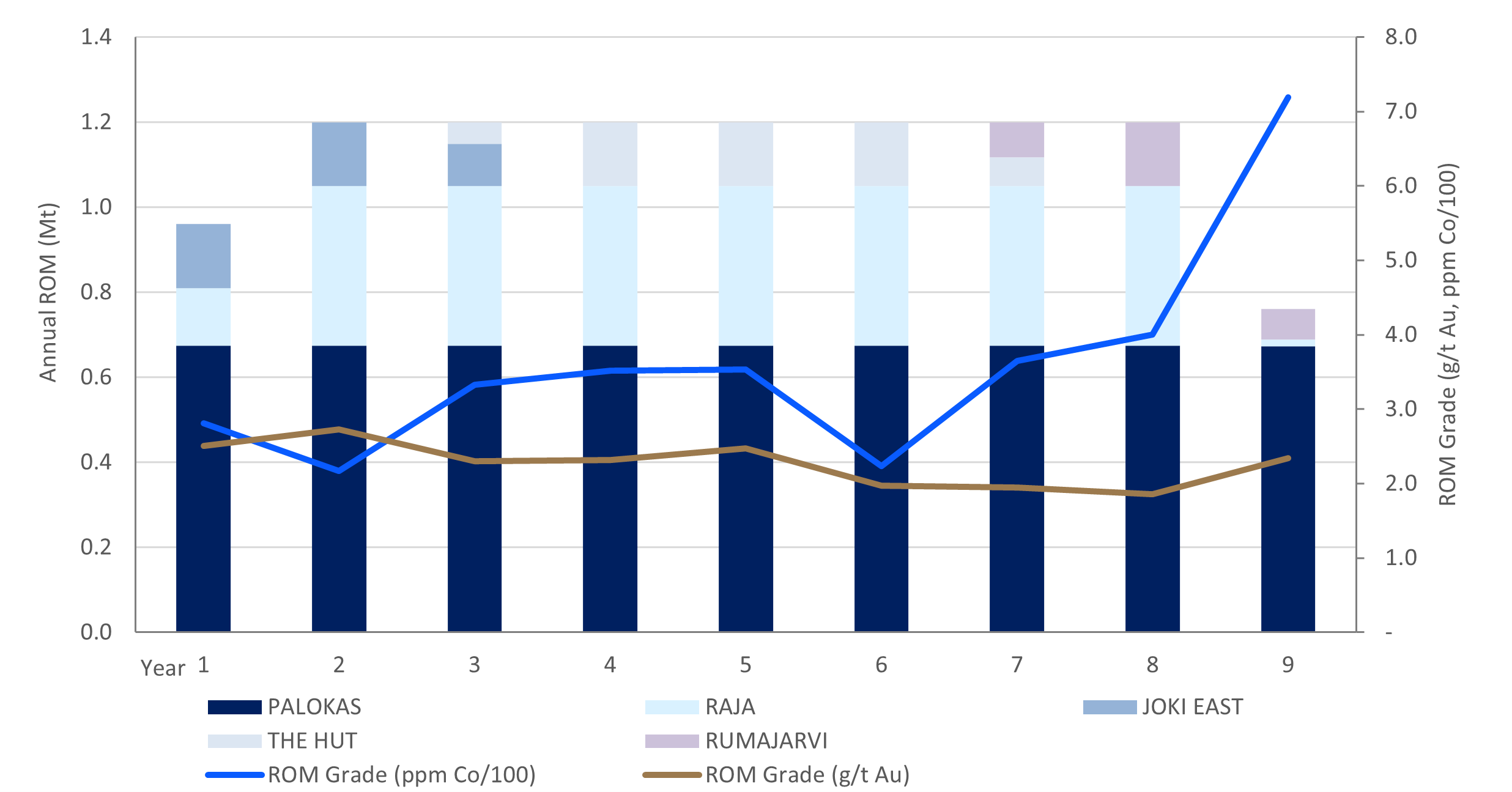 The proposed Rajapalot mine targets a ROM production rate of 1.2 Mt/a through combined mining of 3 deposits at any one time to meet the target annual tonnage (Figure 5). The annual production schedule, which makes allowance for ramp up, is used to derive an equipment fleet schedule including commissioning and replacement periods over the duration of the operation. Fixed and variable labour is estimated for each annual period based on the development, production and equipment schedule. The mine operating cost estimate assumes an owner-operator approach, as is typical in Finland, with mine equipment purchased via a lease-to-own strategy on typical industry terms.