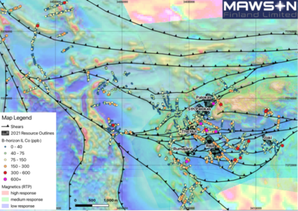 Figure 2: Ionic Leach results for cobalt analysis from B-horizon soils (coloured dots), overlain on composite RTP magnetic image composed of low-altitude drone magnetic and ground magnetic surveys, which includes structural traces (recognised shear zones) of significant orogenic features within the Rajapalot area.