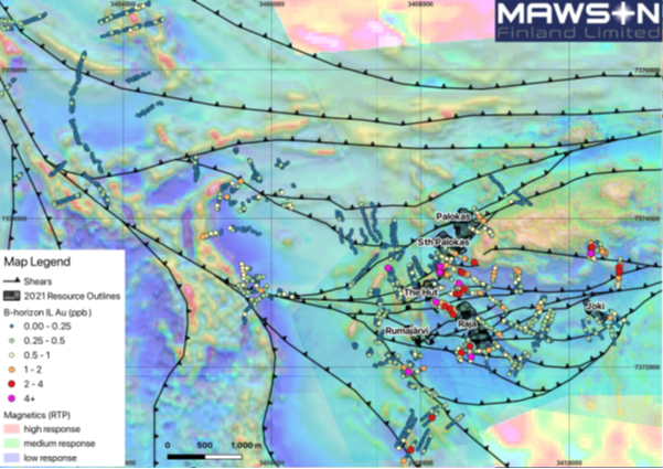 Figure 1: Ionic Leach results for gold analysis from B-horizon soils (coloured dots), overlain on composite RTP magnetic image composed of low-altitude drone magnetic and ground magnetic surveys, which includes structural traces (recognised shear zones) of significant orogenic features within the Rajapalot area.