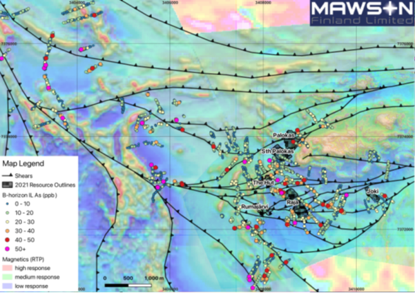 Figure 3: Ionic Leach results for arsenic analysis from B-horizon soils (coloured dots), overlain on composite RTP magnetic image composed of low-altitude drone magnetic and ground magnetic surveys, which includes structural traces (recognised shear zones) of significant orogenic features within the Rajapalot area.