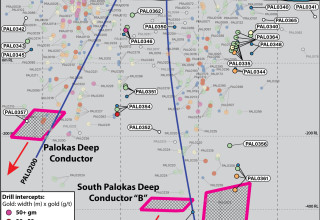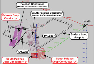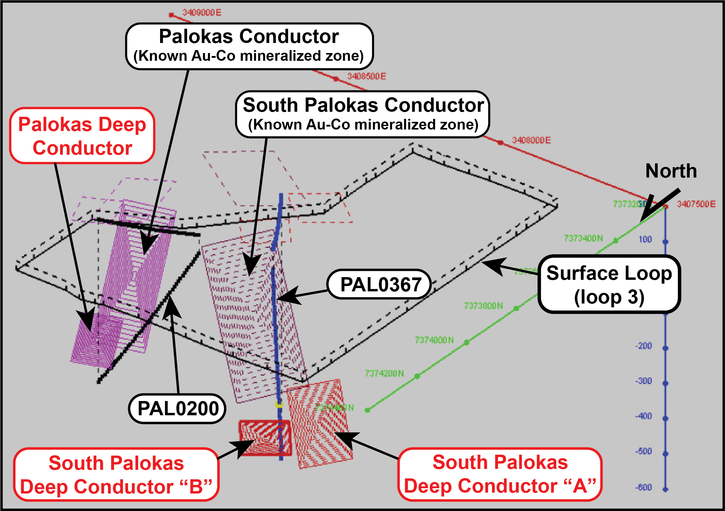 At Palokas, a strong EM-conductive body is interpreted on the lower, northern margin of the mineralized zone, extending down-dip from PAL0200 (loop 3), with the top of this conductor modelled at -129mRL, continuing a further 135 metres in the down-dip direction. This modelled conductor initially appears coincident with the lower portions of the deeper areas of the Palokas mineralized zone however, it is interpreted to be separated from the main Palokas mineralized zone. The anomaly isn't readily explained by simply enlarging the presently known geometry of the Palokas mineralized system down-dip with a northerly plunge and as such, these results suggest an additional lens of gold-cobalt mineralization may exist beyond the known limits of mineralization in the deeper areas of the Palokas zone (refer Table 1, and to 3-D projections in Figure 2 and Figure 3).