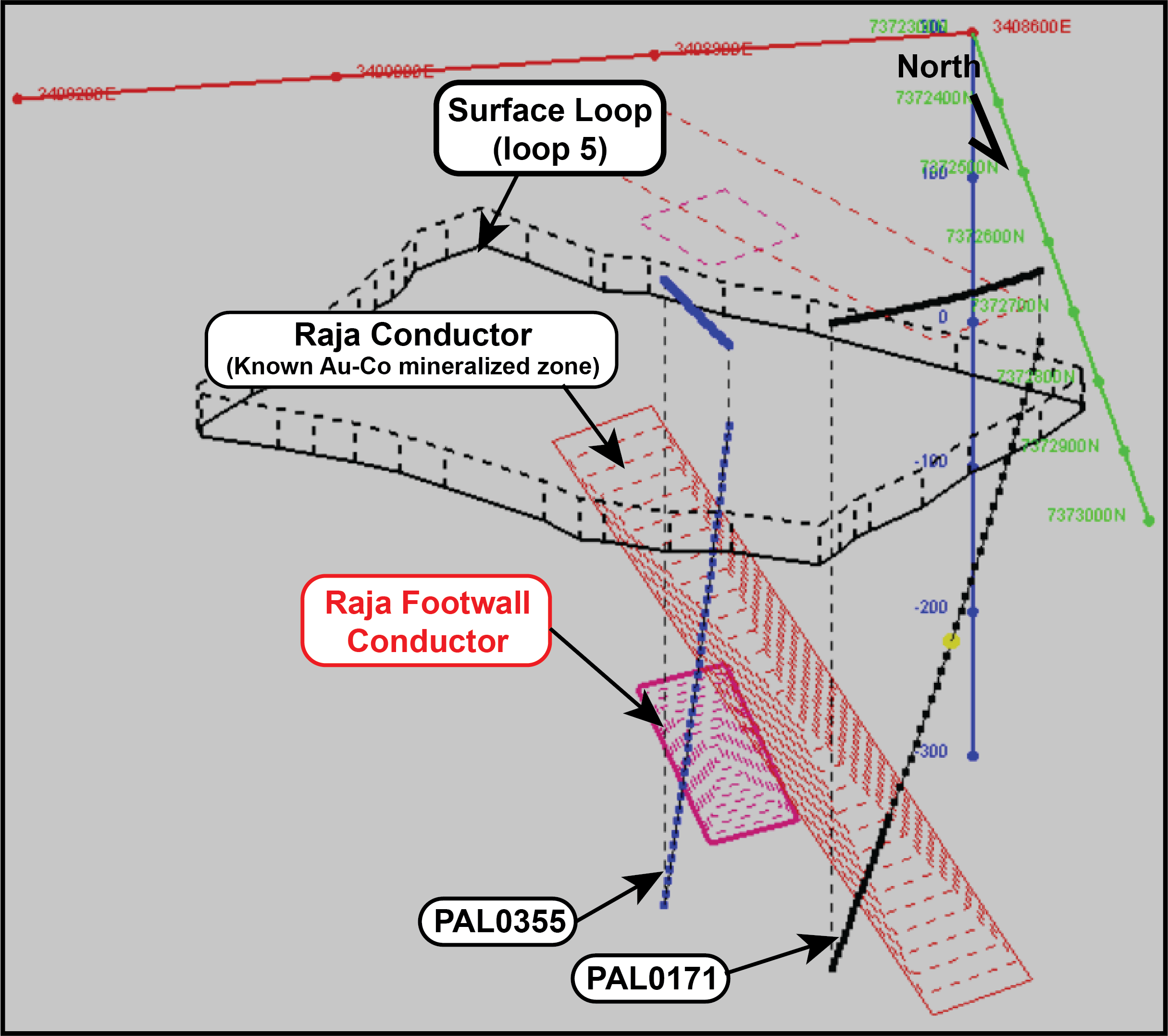 A final loop was set-out in the Raja area, using drillholes PAL0171 and PAL0355 (loop 5; see figure 1). A smaller, 70m by 110m sized, ‘off-hole' conductive anomaly was measured on the mid-northern margin of the Raja zone of gold-cobalt mineralization. Modelling of the conductive anomaly places a plate-anomaly in the footwall of the Raja zone of mineralization, only 30 metres below the known zone by approximately (refer to Figure 5). While this general area has received some drilling previously, no drilling has penetrated the specific area defined in the modelled EM plate, and as such presents a very compelling drill-target.