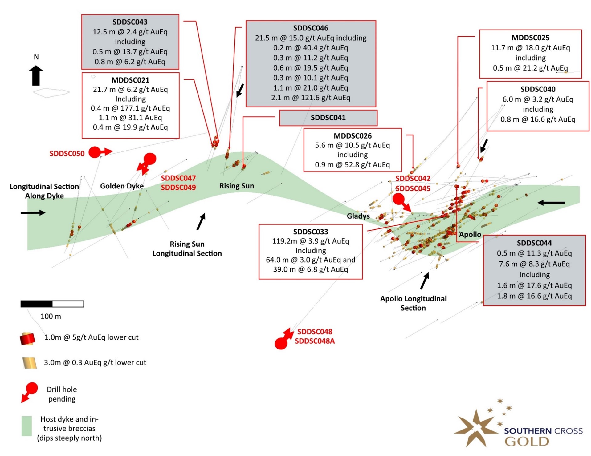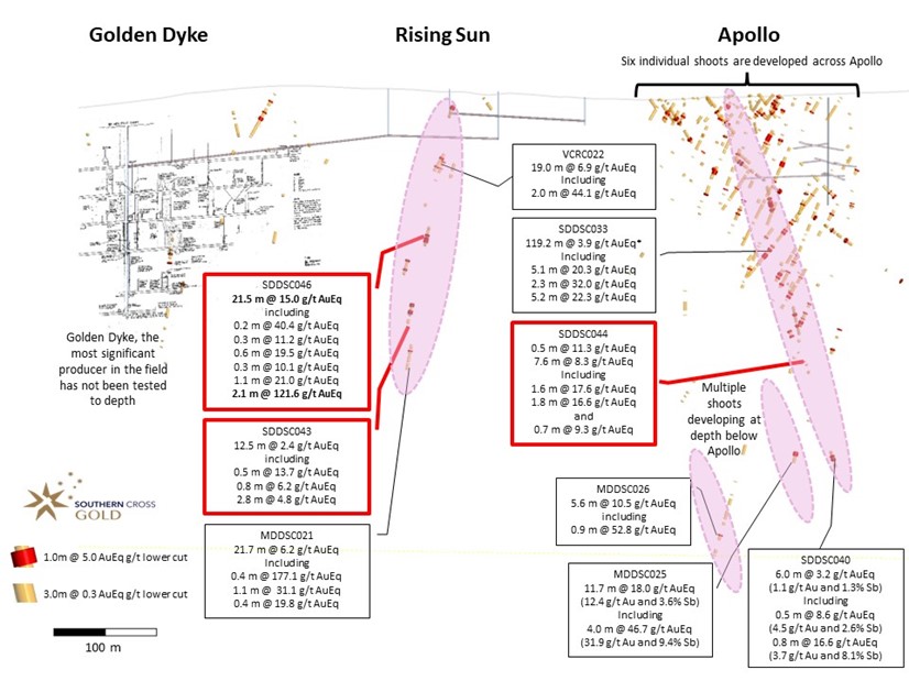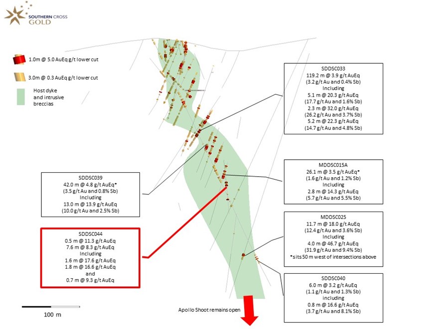 Drilling in other areas also continued with drillhole SDDSC044, reported here, drilled on the Apollo shoot to infill a gap around two "near miss" holes (MDDSC017 and MDDSC027), and 90 m above MDDSC025 (11.7 m @ 18.0 g/t AuEq, including 0.5 m @ 21.2 g/t AuEq). SDDSC044 was successful and continuity in the Apollo shoot going to depth has been validated. SDDSC044 highlights include: