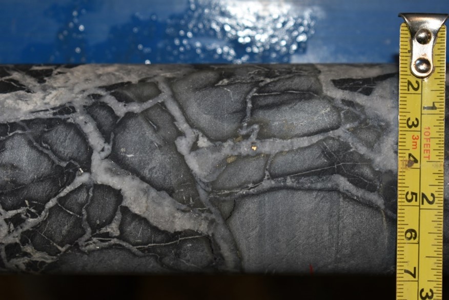 Photos 1,2, 3: Selected quartz carbonate veining and stockwork zone with abundant visible gold from 199.0-199.4 m (assayed 380.3g/t Au and 0.24% Sb) in drillhole SDDSC046 from the Rising Sun shoot. Brecciated gold-mineralized wall rocks are healed by quartz-carbonate veining and commonly have a halo of disseminated arsenopyrite and pyrite in the walls, extending for up to 50 cm beyond the veins. This is similar to other epizonal deposits such as Fosterville.