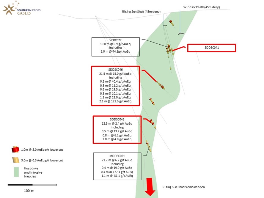 The Rising Sun shoot remains open at depth below MDDSC021 and is currently being tested by drillhole SDDSC050, which remains in progress (Figure 2).