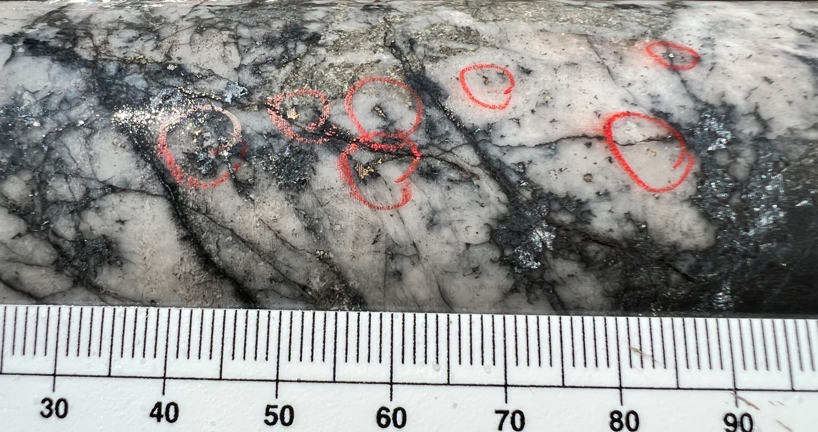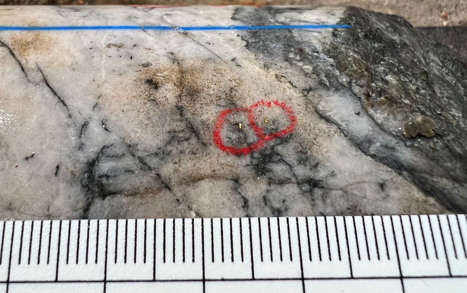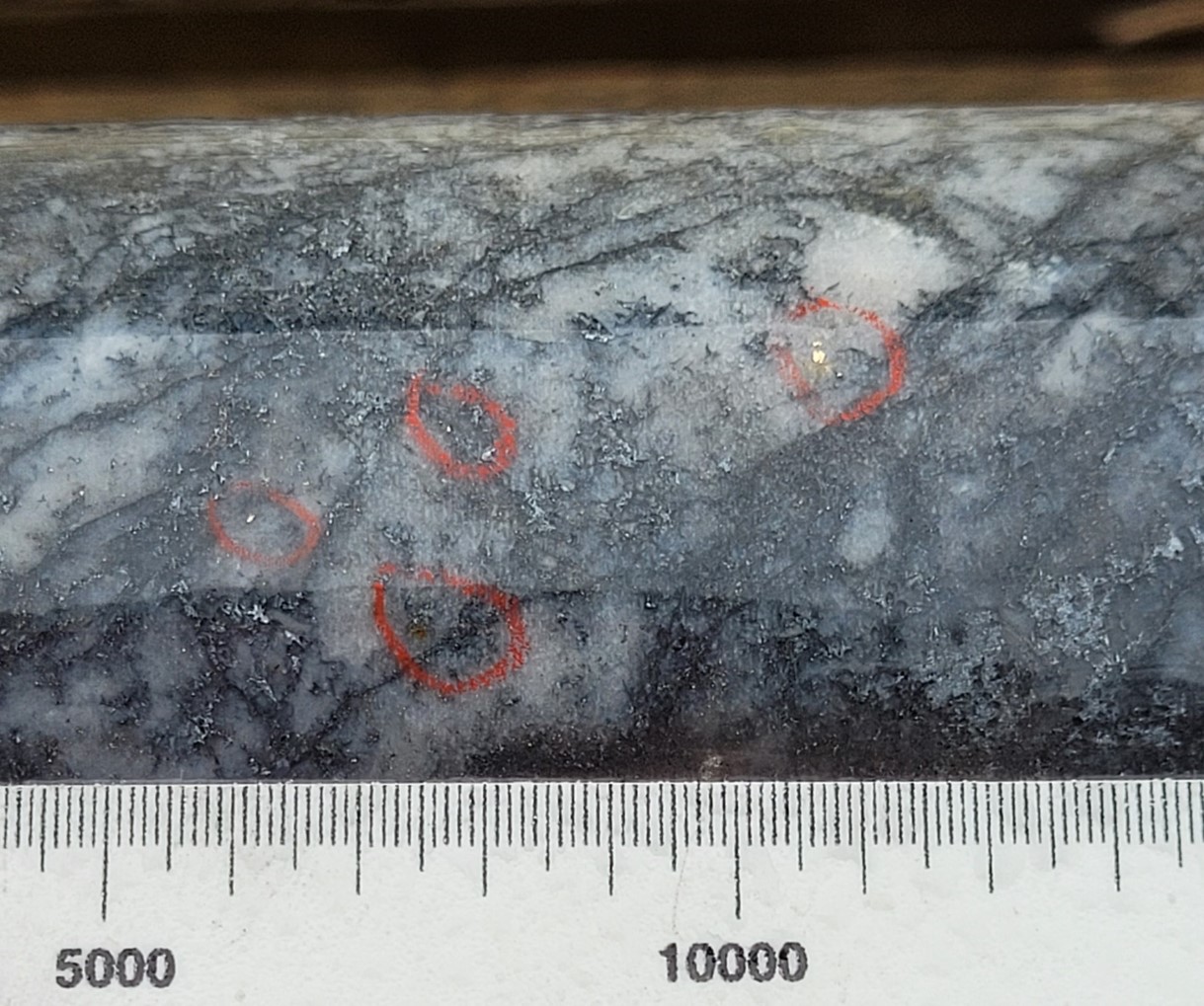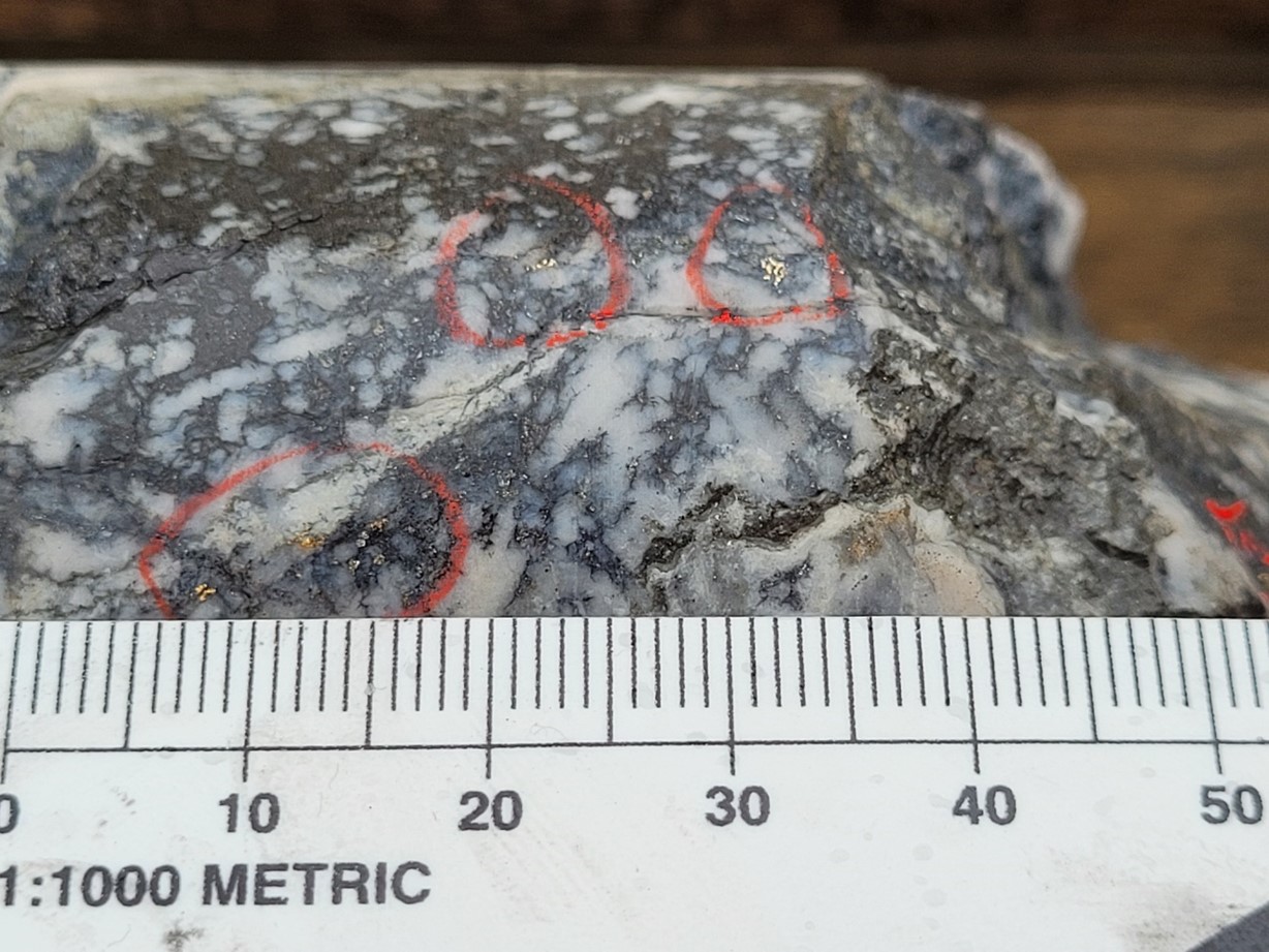 Photo 1: SDDSC050 419.4 m showing visible gold in yellow circles within quartz, carbonate and stibnite vein in altered metasediment. Scale bar in mm.